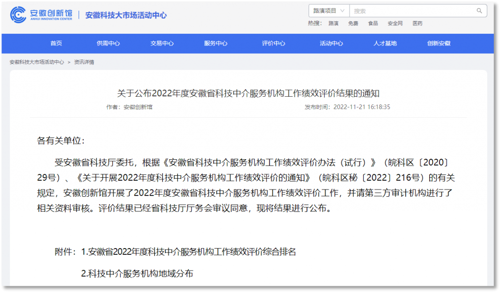 11月21日,,,,由安徽省科技厅组织的2022年度安徽省科技中介服务机构工作绩效评价结果正式公布,,此次绩效评价综合排名公布名单114家。。。凯时尊龙科技服务有限公司在此次评价中,,,,综合排名全省第六名(皖南片区第一名...